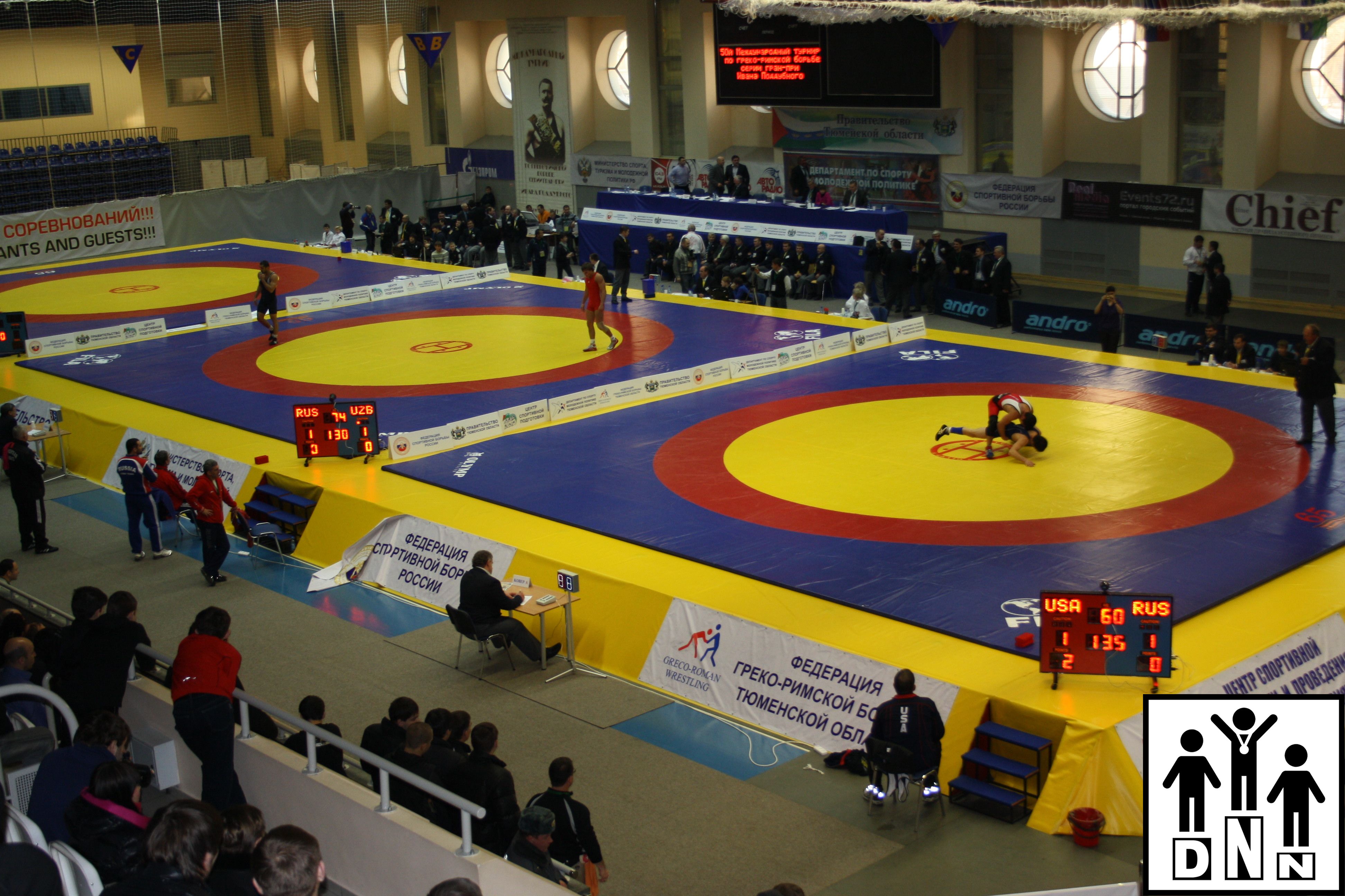 Модульная конструкция помоста позволяет использовать его как подиум для одного, двух, и трех борцовских ковров.