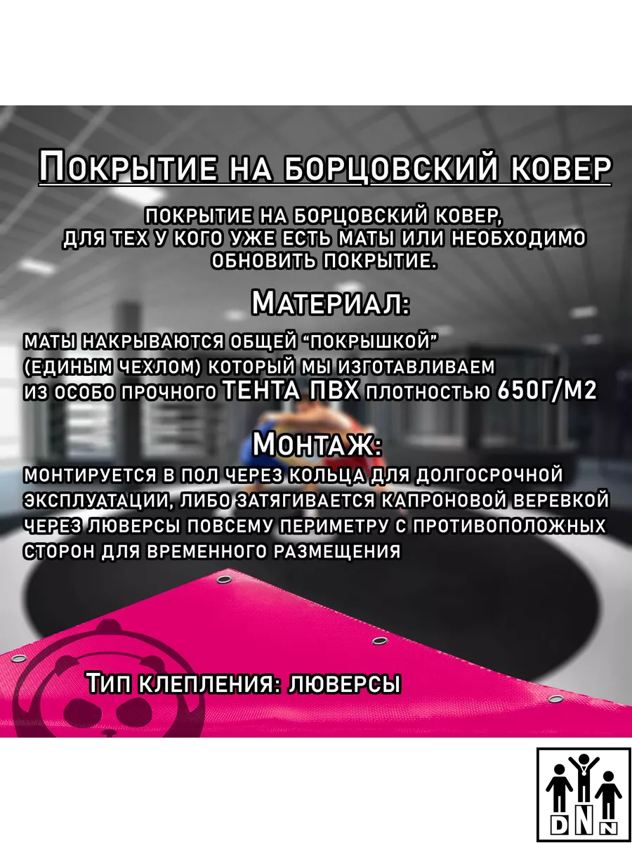 Покрытие для борцовских ковров из импортного покрытия ПВХ (Корея) плотностью 650 гр/м2. Ткань ПВХ — идеальное современное покрытие, которое отвечает всем нормативам европейских стандартов, требованиям к пожаробезопасности и экологичности. Во-первых, она достаточно проста в уходе и имеет отличные показатели прочности. Во-вторых, ткань имеет правильное соотношение мягкости и упора, равномерно ранжирует силовую динамическую нагрузку. И наконец, соответствует максимальным параметрам прочности и устойчивости к изгибам, имеет продолжительный эксплуатационный период. Для наполнения борцовских ковров мы рекомендуем маты из ППЭ размером 1х2 метра толщиной 40 мм. Размер чехла: 500см * 500см. Маты в комплектацию не входят!!!
