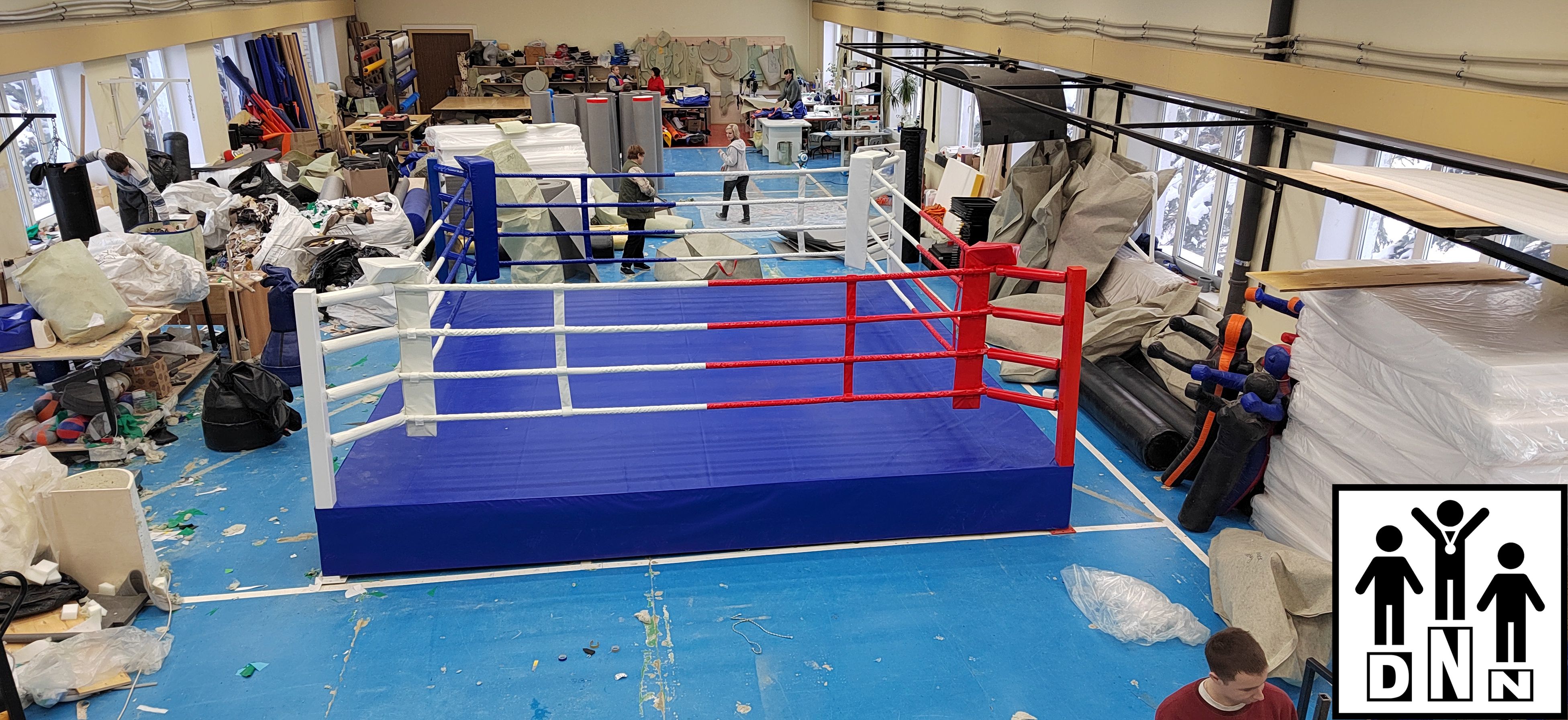 Ринг на помосте прекрасно подходит для проведения тренировок и соревнований по боксу и другим видам контактного кулачного боя. Устанавливается чаще в закрытых помещениях, т.к. там ринг менее подвержен воздействию агрессивных факторов окружающей среды. При желании его можно установить и на улице, даже и на не очень ровной поверхности, компенсировать которую можно регулировками помоста, в этом его большое преимущество перед напольными рингами. Основой ринга служит ферма собираемая из металлических рам, скрепленных между собой болтами. Поверх фермы устанавливаются листы фанеры, они же и образуют пол боксерского ринга. На фанеру укладываются листы мягкого настила из матов ППЭ толщиной 20 мм и накрываются покрытием из ПВХ.