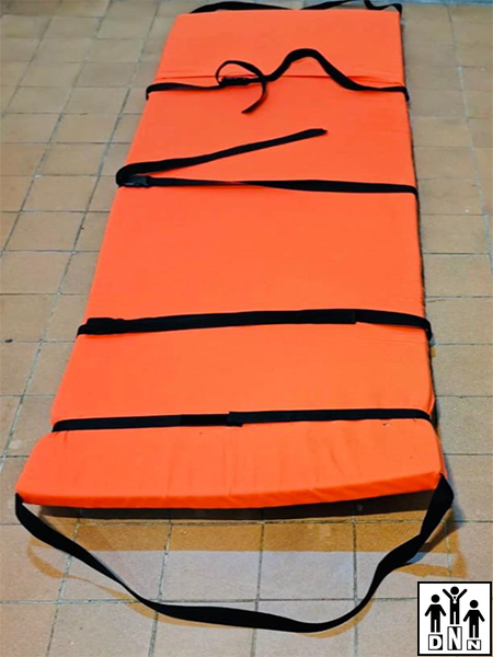 Эвакуационный мат (волокуши) DNN оборудован ремнями, с помощью которых пациент фиксируется на матрасе (ремни соединяются пряжками), и торцевыми ручками, за которые медперсонал перетаскивает матрас с пациентом. Прочная скользящая виниловая основа позволяет без особых усилий перемещать пациентов по фактически любым поверхностям. Поэтому для перемещения пациента не нужно обладать выдающими физическими данными. Двум медсестрам не составит труда эвакуировать одного пациента. Мат из поролона толщиной 50 мм защищает от синяков и неровностей.