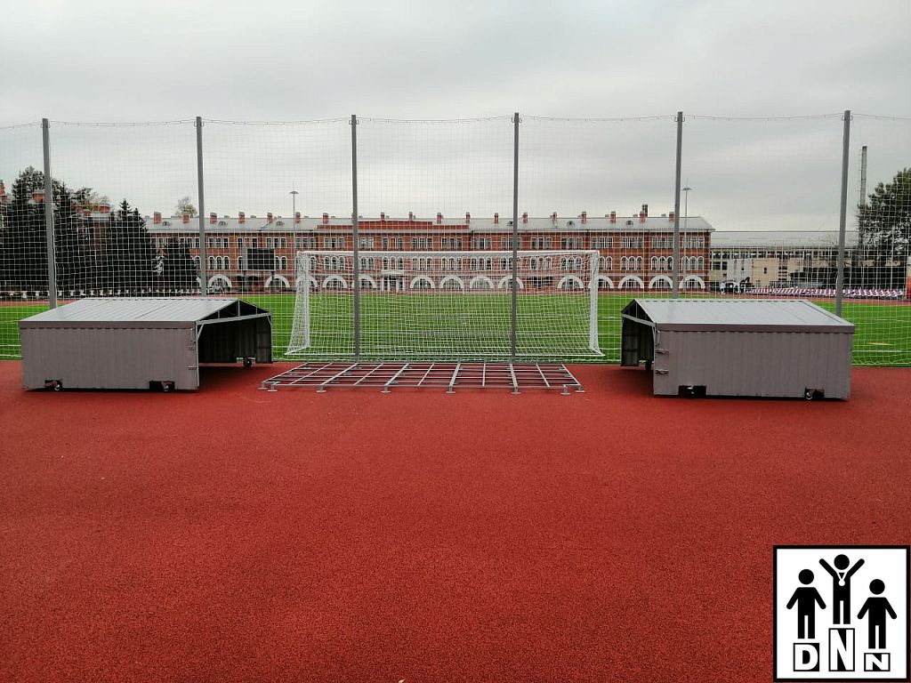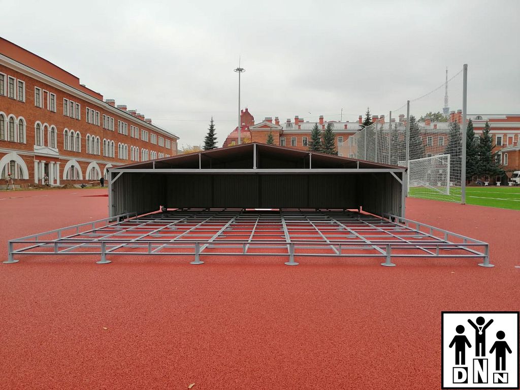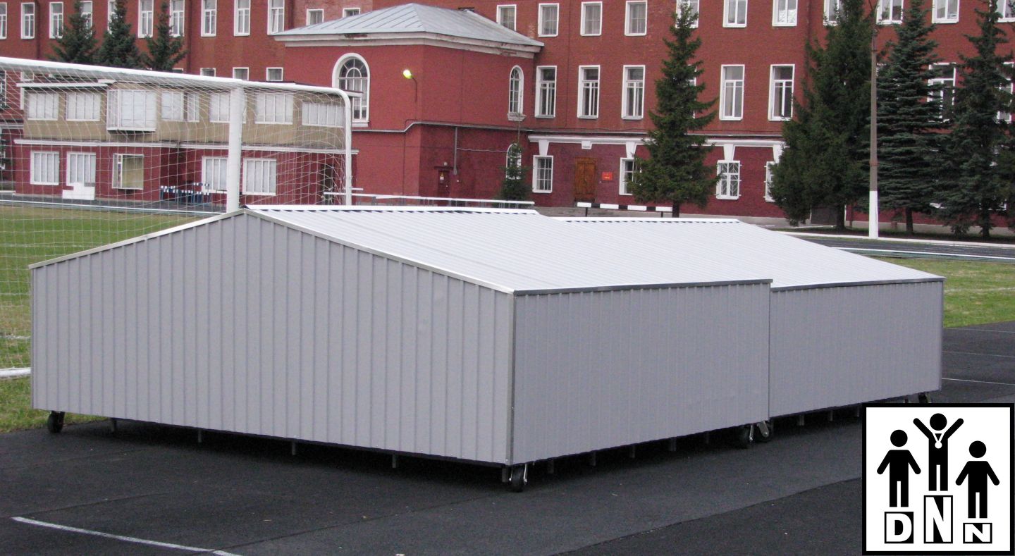 Гараж для места приземления прыжков в высоту размером 7х5х0,8 м. Состоит из двух частей; крепление профильного листа к металлоконструкции с помощью клепок. Стыки под прямым углом между листами закрыты крашенными алюминиевыми уголками