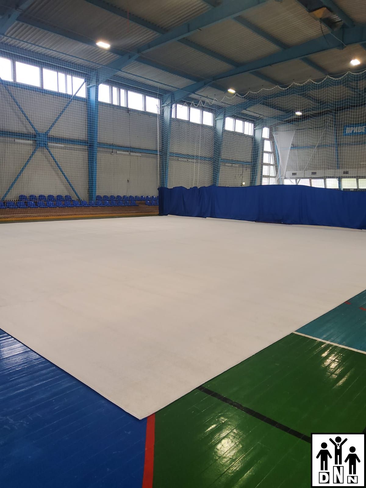 Подложка ковра для гимнастики - синтетический войлок, обеспечивает звукоизоляцию и мягкость. Верхний слой - велюровый, плотный, упругий, износоустойчивый ворс высотой 8 мм. Цвет - бежевый.