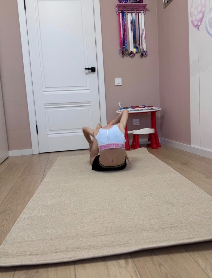 Подложка ковра для гимнастики - синтетический войлок, обеспечивает звукоизоляцию и мягкость. Верхний слой - велюровый, плотный, упругий, износоустойчивый ворс высотой 8 мм. Цвет - бежевый