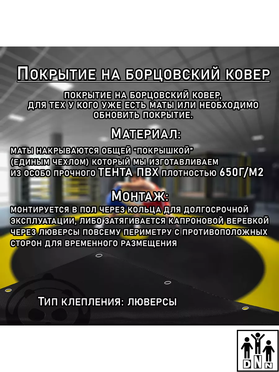 Покрытие для борцовских ковров из импортного покрытия ПВХ (Корея) плотностью 650 гр/м2. Ткань ПВХ — идеальное современное покрытие, которое отвечает всем нормативам европейских стандартов, требованиям к пожаробезопасности и экологичности. Во-первых, она достаточно проста в уходе и имеет отличные показатели прочности. Во-вторых, ткань имеет правильное соотношение мягкости и упора, равномерно ранжирует силовую динамическую нагрузку. И наконец, соответствует максимальным параметрам прочности и устойчивости к изгибам, имеет продолжительный эксплуатационный период. Для наполнения борцовских ковров мы рекомендуем маты из ППЭ размером 1х2 метра толщиной 40 мм. Размер чехла: 200см * 200см. Маты в комплектацию не входят!!!