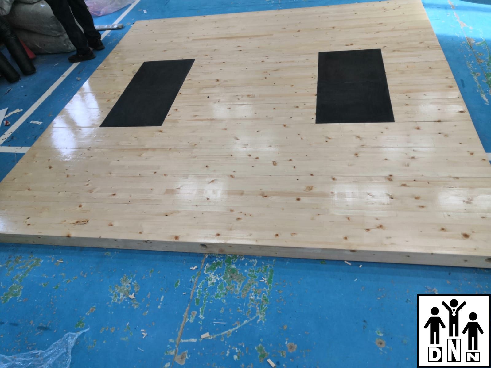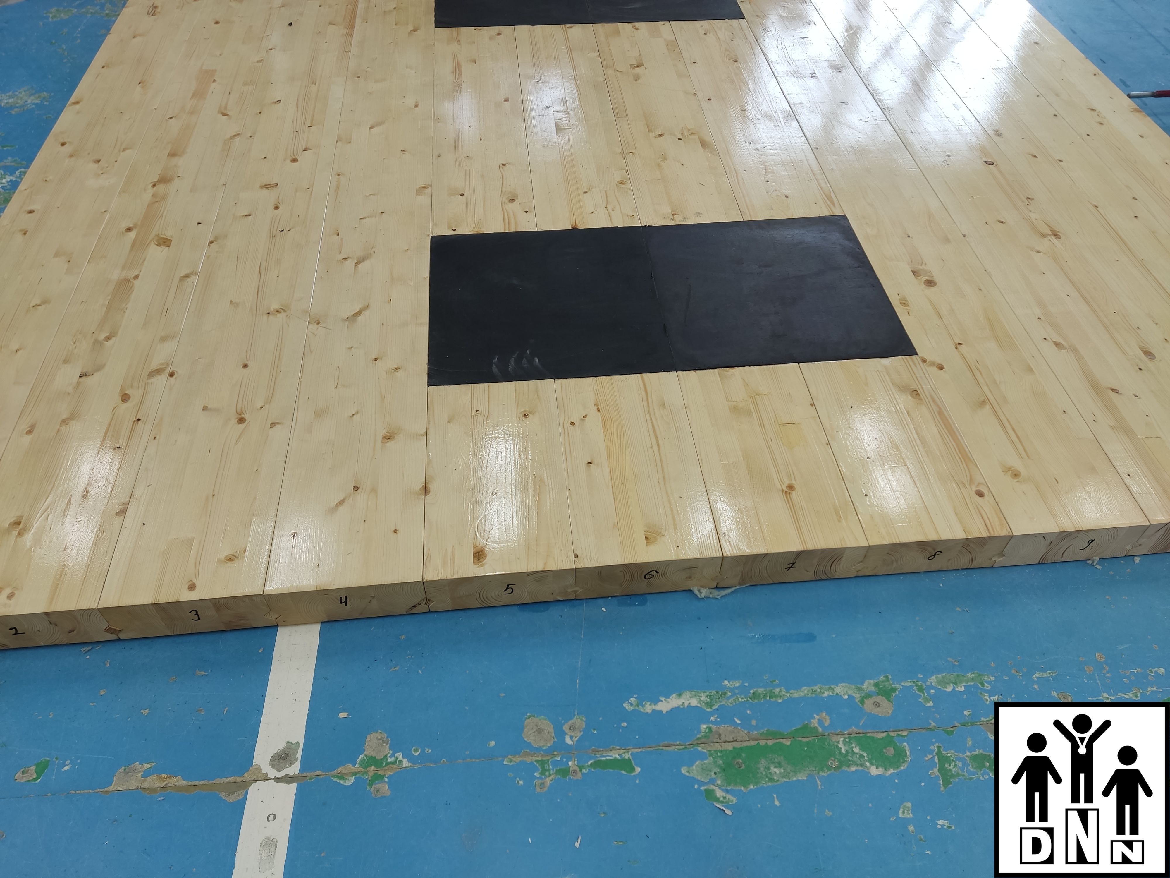 Помост представляет из себя квадратную сборную платформу, состоящую из шестнадцати деревянных секций одинаковых по габариту, но отличающихся по конструкции . Они фиксируются относительно друг – друга специальными шпильками. В шести центральных секциях врезаны 6 амортизационные дорожки (составные или цельные).