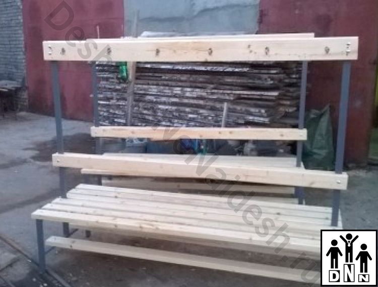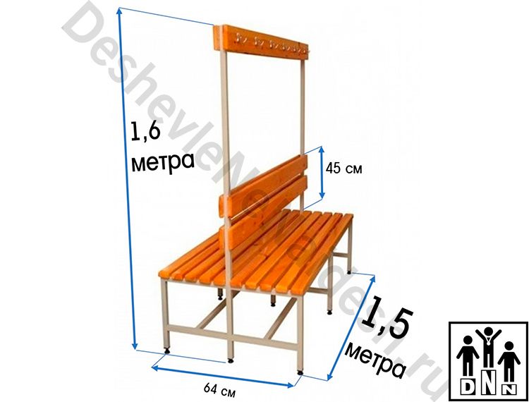 Удобная,оптимальная скамейка для раздевалок. Устанавливается в школах, спортивных комплексах, фитнес центрах. Изготавливается из стального профиля сечением 40х20х1,5мм с последующей покраской. Сиденье из деревянных реек толщиной от 35 мм покрытых экологически чистым, влагостойким лаком. По 5 крючков с каждой стороны. Основные размеры скамейки: Ширина - 64 см; Высота сиденья - 45 см; Длина 150 см. Общая высота 160 см.