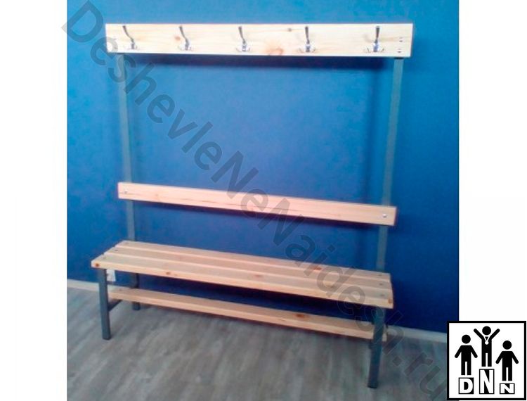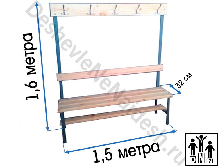 Очень прочные и долговечные скамейки для раздевалок со спинкой и вешалкой. Каркас - из крепкого стального прямоугольного профиля 20х40 мм. Все элементы скамеек отличаются надёжностью, скамьи практичны и неприхотливы в эксплуатации. Полимерное защитно-декоративное покрытие, особо прочное, коррозионно-стойкое, устойчиво к перепадам температуры. Сиденье скамьи - три массивные доски (древесина хвойных пород толщиной 35 мм), пропитанные антисептиком и покрытые водостойким лаком. Скамейка снабжена спинкой и вешалкой, стойка к влаге, и большим нагрузкам, что обусловливает широкий диапазон условий её использования. Скамья - разборная, конструкционные элементы её скрепляются с помощью винтов и стяжек М8. Размер (В,Д,Г) - 1600, 1500, 320 мм. Крючков для одежды - 5.